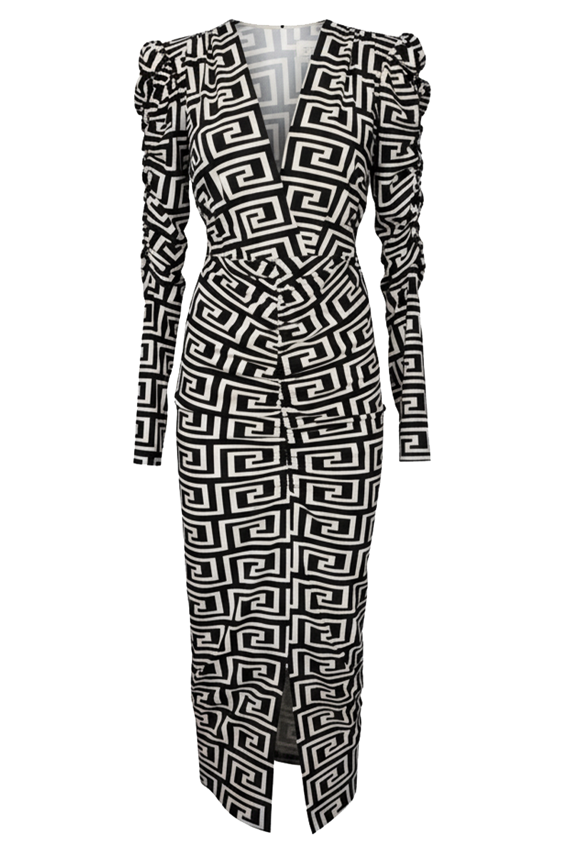 Haljina "Geometric Impact" kombinira modernu sofisticiranost i upečatljiv dizajn. Sa svojim hrabrim geometrijskim printom i prilagodljivim strukom naglašenim elegantnim remenom, ova haljina savršena je za one koji žele biti u centru pažnje. Dugački rukavi i ženstveni kroj čine je idealnim izborom za dnevne pa i večernje prilike te poslovne događaje. Haljina pruža udobnost i stil, a izrađena je od kvalitetnog materijala koji osigurava besprijekoran izgled.