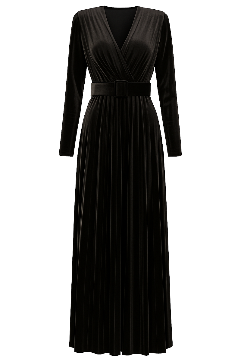 Haljina "Velvet Obsession" savršeno utjelovljuje luksuz i profinjenost. Izrađena od visokokvalitetnog baršuna, pruža neodoljiv osjećaj udobnosti i sofisticiranosti. Nježno plisirani dizajn naglašava ženstvenu siluetu, dok pojas u struku omogućava savršeno prilagođavanje figuri. Ova haljina dolazi u dvije elegantne boje – klasičnoj crnoj i raskošnoj kraljevsko plavoj, čineći je idealnim izborom za dnevne događaje ili večernje izlaske.