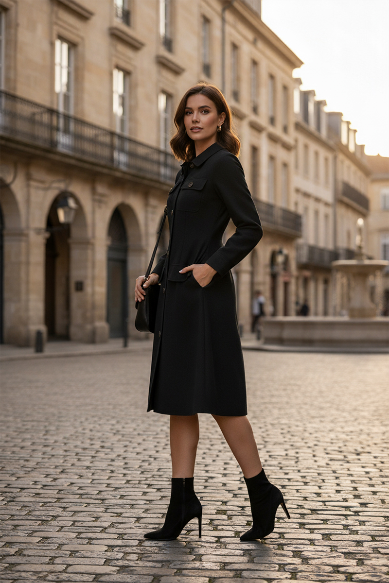 Haljina "Executive Edge" savršen je spoj funkcionalnosti i stila, idealna za moderne žene koje cijene profinjen izgled. Inspirirana klasičnim krojem, s dugmadima cijelom dužinom i praktičnim džepovima, ova haljina ističe vašu profesionalnu eleganciju. Dolazi u tri klasične nijanse: crnoj, tamnosivoj i sivoj, pružajući fleksibilnost za poslovne i formalne prigode. Svojom strukturalnom siluetom i detaljima poput elegantnog ovratnika, unosi dozu sofisticiranosti u svaku garderobu.