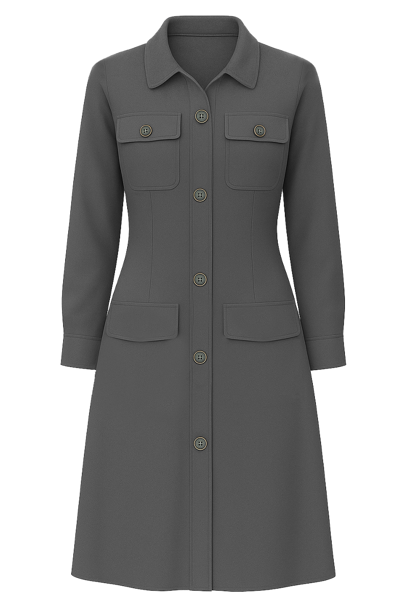 Haljina "Executive Edge" savršen je spoj funkcionalnosti i stila, idealna za moderne žene koje cijene profinjen izgled. Inspirirana klasičnim krojem, s dugmadima cijelom dužinom i praktičnim džepovima, ova haljina ističe vašu profesionalnu eleganciju. Dolazi u tri klasične nijanse: crnoj, tamnosivoj i sivoj, pružajući fleksibilnost za poslovne i formalne prigode. Svojom strukturalnom siluetom i detaljima poput elegantnog ovratnika, unosi dozu sofisticiranosti u svaku garderobu.
