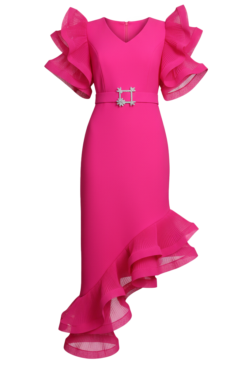 Haljina "Ruffle Radiance" utjelovljuje odvažnost i sofisticiranost, savršena za one koji žele ostaviti snažan dojam. S upečatljivim volanima na rukavima i asimetričnim završetkom suknje, ova haljina odiše dinamikom i elegancijom. Naglašeni remen sa sjajnom dekoracijom dodatno ističe struk, dok vibrantna fuksija nijansa donosi energiju i glamur. Idealan izbor za gala večeri, koktel zabave i sve posebne prilike.