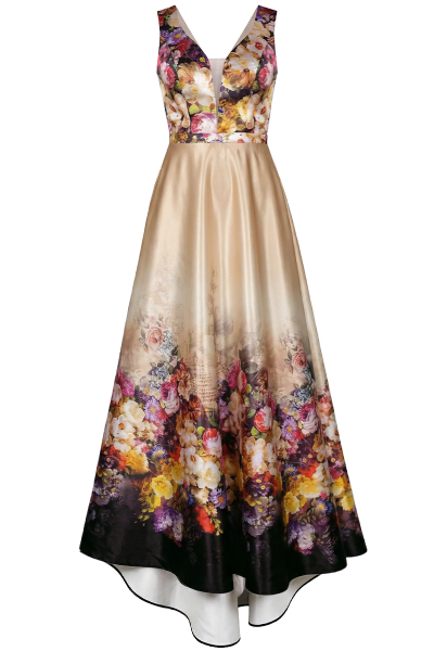 Otvorena leđa unose suptilnu dozu modernosti i lakoće, dok lepršava suknja pruža graciozan pokret i luksuzan vizualni efekt. Kontrast bogatih cvjetnih tonova i elegantne podloge čini ovu haljinu upečatljivim, ali profinjenim izborom.