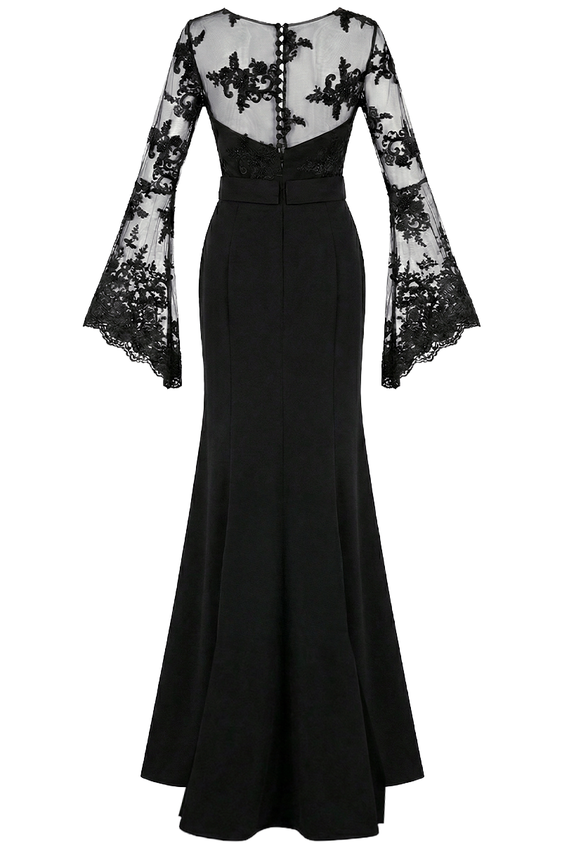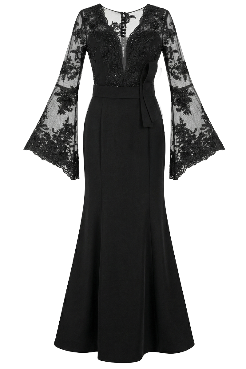 Gornji dio haljine izrađen je od bogato ukrašene čipke s reljefnim floralnim aplikacijama koje stvaraju teksturalnu dubinu i luksuzni vizualni dojam. Duboki V-izrez naglašava dekolte, dok prozirni dugi rukavi s aplikacijama donose dramatičnu, ali profinjenu notu. Prirodni struk definira siluetu i osigurava elegantan prijelaz prema fluidnom donjem dijelu.