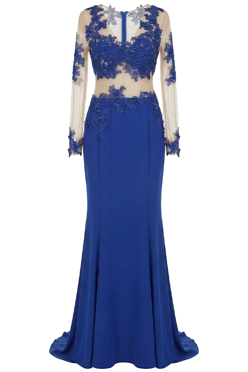 Gornji dio haljine izrađen je od prozirne podloge bogato ukrašene 3D floralnim aplikacijama, bisernim detaljima i suptilnim kristalnim akcentima koji stvaraju dojam luksuza bez pretjerivanja. Duboki V-izrez dodatno naglašava eleganciju dekoltea, dok prozirni dugi rukavi s aplikacijama daju sofisticiran i romantičan završetak.