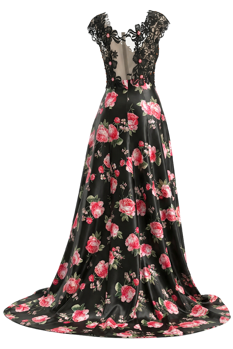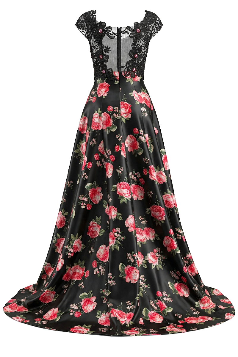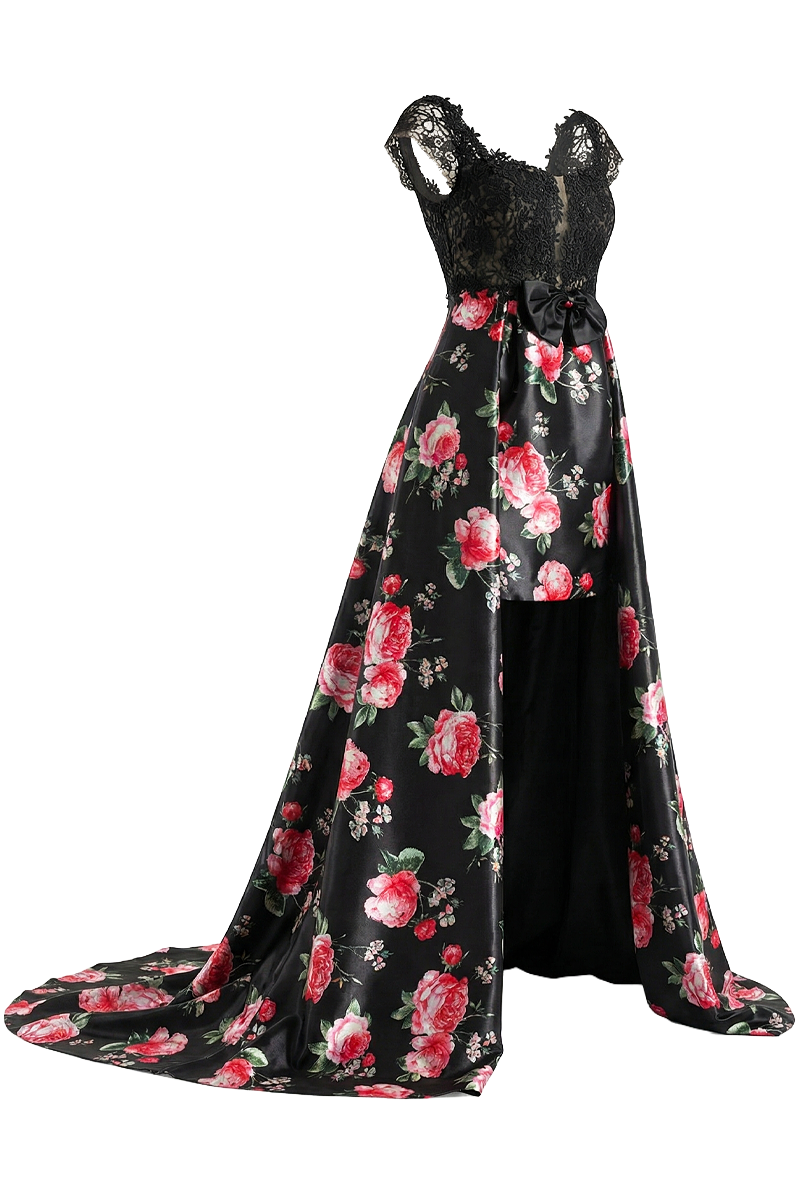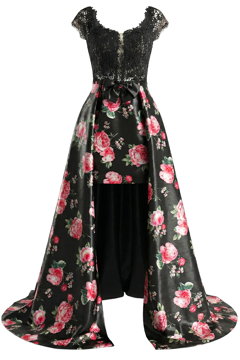 Svečana haljina Floral Empire spaja raskoš cvjetnog uzorka s profinjenom elegancijom čipke, stvarajući izrazito upečatljiv i ženstven model. Gornji dio izrađen je od bogate crne čipke koja nježno naglašava siluetu i daje dojam sofisticirane lakoće, dok donji dio haljine donosi dramatičan kontrast kroz cvjetni uzorak na satenskoj podlozi. Poseban dizajnerski element čini asimetrični kroj s kratkom prednjom dužinom i dugim, lepršavim stražnjim dijelom koji se graciozno kreće pri svakom koraku. Floral Empire idealan je izbor za svečane prigode, večernje evente, domjenke i posebne proslave kada želite ostaviti snažan, elegantan dojam uz dozu modnog karaktera.