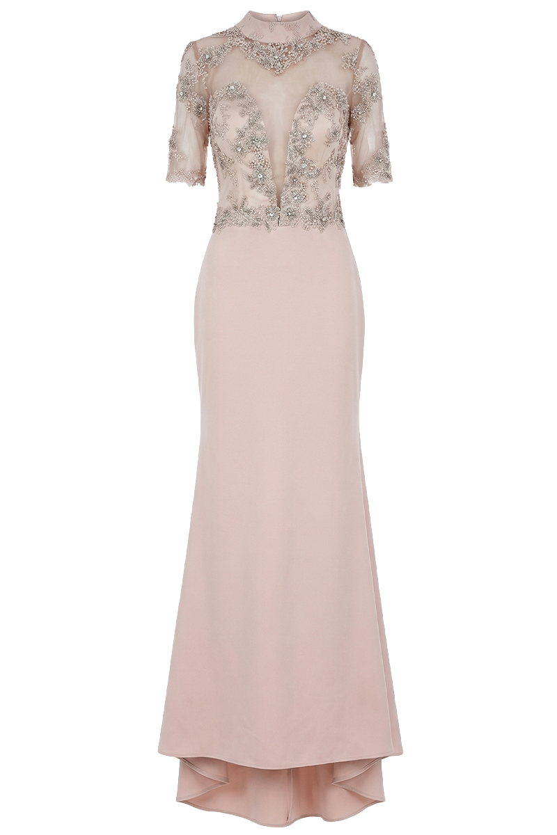 Večernja haljina Celestine Passion spoj je glamura, elegancije i senzualne ženstvenosti. Donji dio izrađen je od svila satena koji se nježno spušta niz siluetu i stvara profinjen, luksuzan dojam pri svakom pokretu. Gornji dio oblikovan je kao korzet koji ističe struk i naglašava liniju tijela, dok čipka ukrašena perlama i cirkonima dodaje raskošnu, svjetlucavu notu.