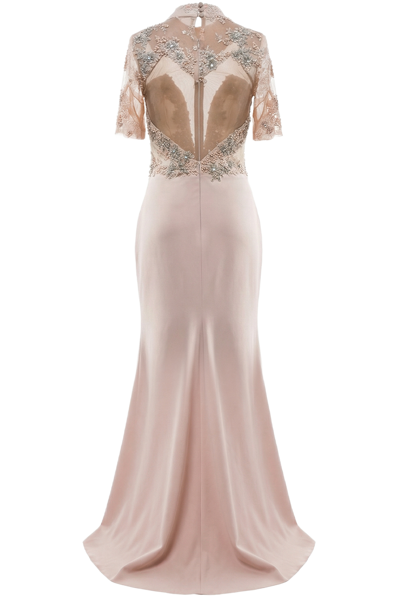 Transparentni čipkasti detalji i pažljivo raspoređene aplikacije stvaraju sofisticiran vizualni efekt koji haljinu čini idealnim izborom za gala večeri, svečane proslave, formalne događaje i posebne prilike. Spoj strukture korzeta i fluidnosti satena osigurava savršen balans između čvrstoće i elegancije.