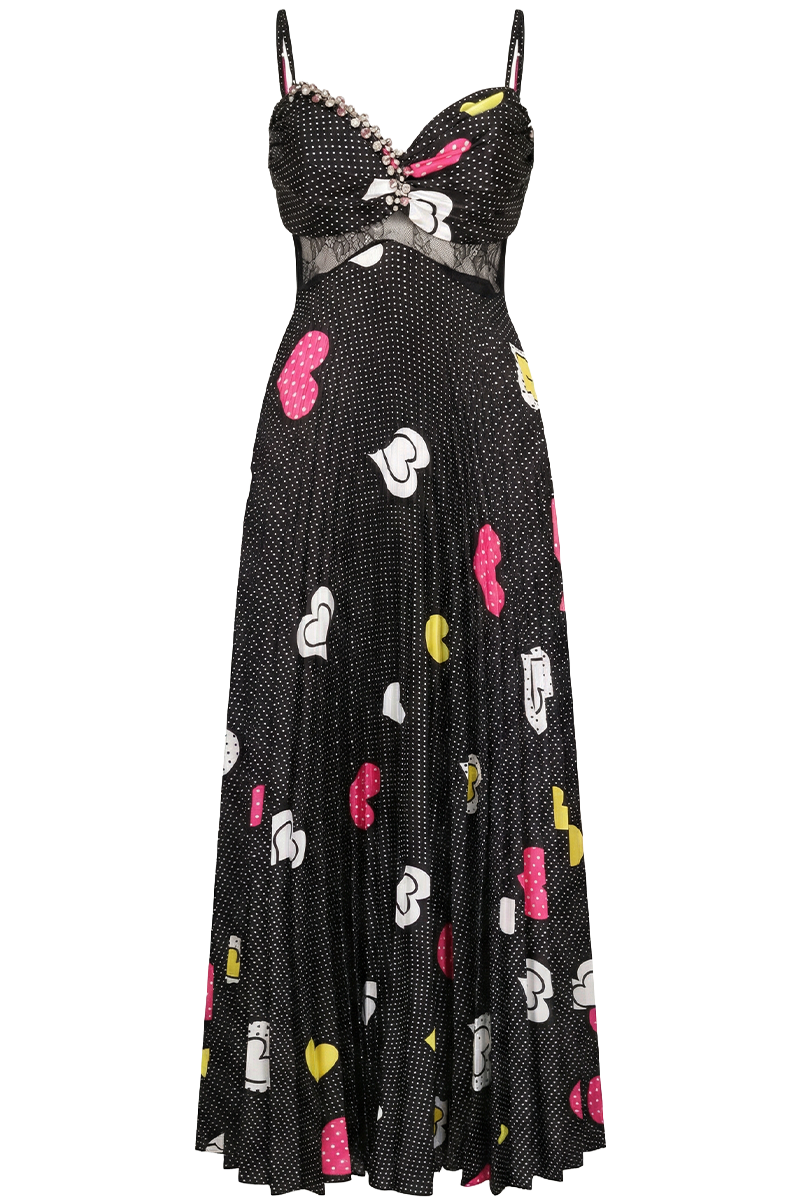 Večernja haljina Dolce Amore spaja razigrani retro šarm i modernu ženstvenost u sofisticiranoj večernjoj silueti. Crna podloga s nježnim točkicama i kontrastnim motivima unosi dinamiku i karakter, dok lagano lepršava suknja daje osjećaj pokreta i elegancije pri svakom koraku.