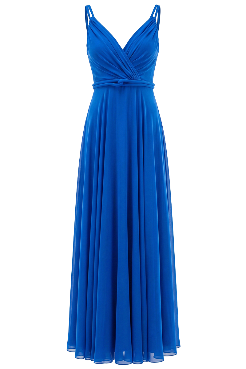 Izrađena od svilenog šifona, haljina pruža nježan osjećaj na koži te fluidnost pri svakom koraku. Gornji dio decentno oblikuje liniju dekoltea, dok naglašeni struk ističe ženstvenu figuru, a donji dio se elegantno širi u dugoj, prozračnoj silueti.
