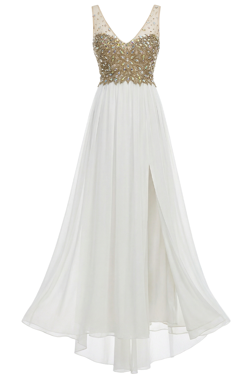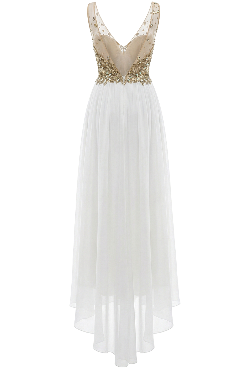 Večernja haljina Glacielle Prestige utjelovljuje spoj glamura i profinjene elegancije. Bogato ukrašeni gornji dio s perlicama i kristalnim aplikacijama stvara luksuzan vizualni efekt, dok duboki V-izrez i otvorena leđa naglašavaju ženstvenu siluetu s dozom profinjenosti.