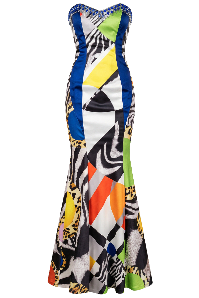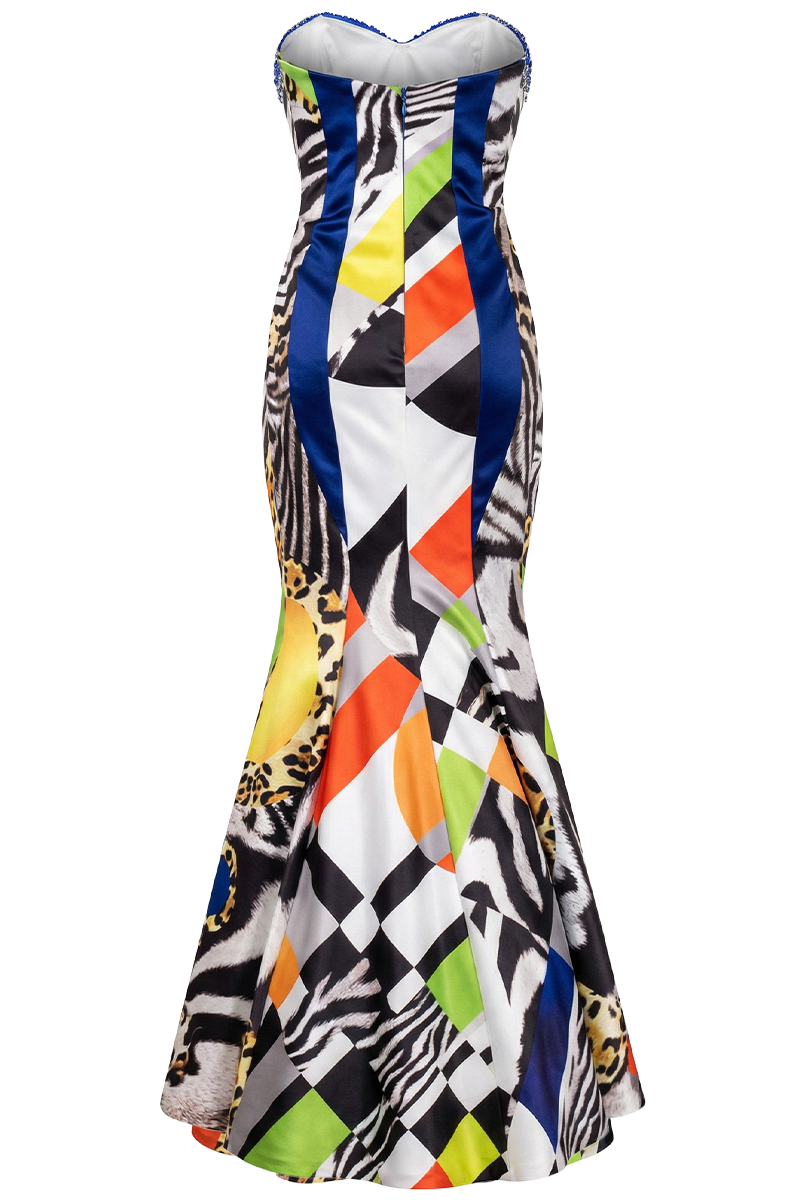 Večernja haljina Graphic Gala osmišljena je kao suvremeni gala komad koji spaja snažan grafički print s elegantnom, ženstvenom linijom. Ovaj model donosi upečatljivu vizualnu dinamiku kroz kombinaciju geometrijskih elemenata i animal motiva, dok kroj ostaje precizno strukturiran i sofisticiran.