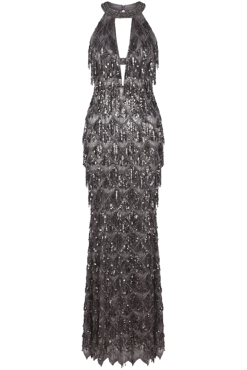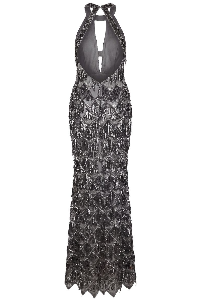 Midnight Cascade je spektakularna večernja haljina inspirirana bezvremenskim Art Deco glamourom. Bogato ukrašena perlicama i resicama koje se nježno prelijevaju pri svakom pokretu, ova haljina stvara dramatičan i sofisticiran dojam. Halter izrez i otvorena leđa dodatno naglašavaju eleganciju siluete, dok precizno izrađena struktura osigurava profinjeno pristajanje.