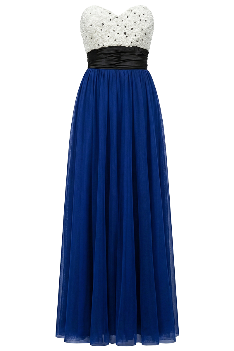 Silueta je A-linija, s jasno definiranim strukom i punim padom suknje u maksimalnoj dužini, što stvara izduženu i svečanu vertikalu. Gornji dio oblikovan je kao korzet sa sweetheart izrezom, bez naramenica, naglašavajući dekolte na sofisticiran način.