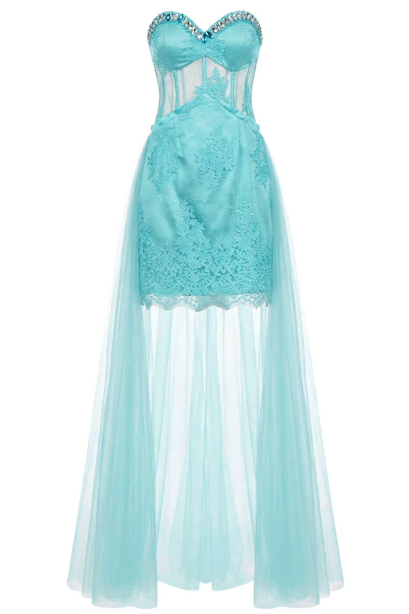 Večernja haljina Runway Princess spaja modernu siluetu i bajkovitu eleganciju u upečatljiv dizajn koji privlači poglede. Strukturirani korzet s profinjenim detaljima naglašava struk i oblikuje figuru, dok kratka čipkasta baza donosi dozu mladenačke razigranosti. Dramatični sloj laganog tila koji se spušta do poda stvara efekt luksuza i pokreta pri svakom koraku.