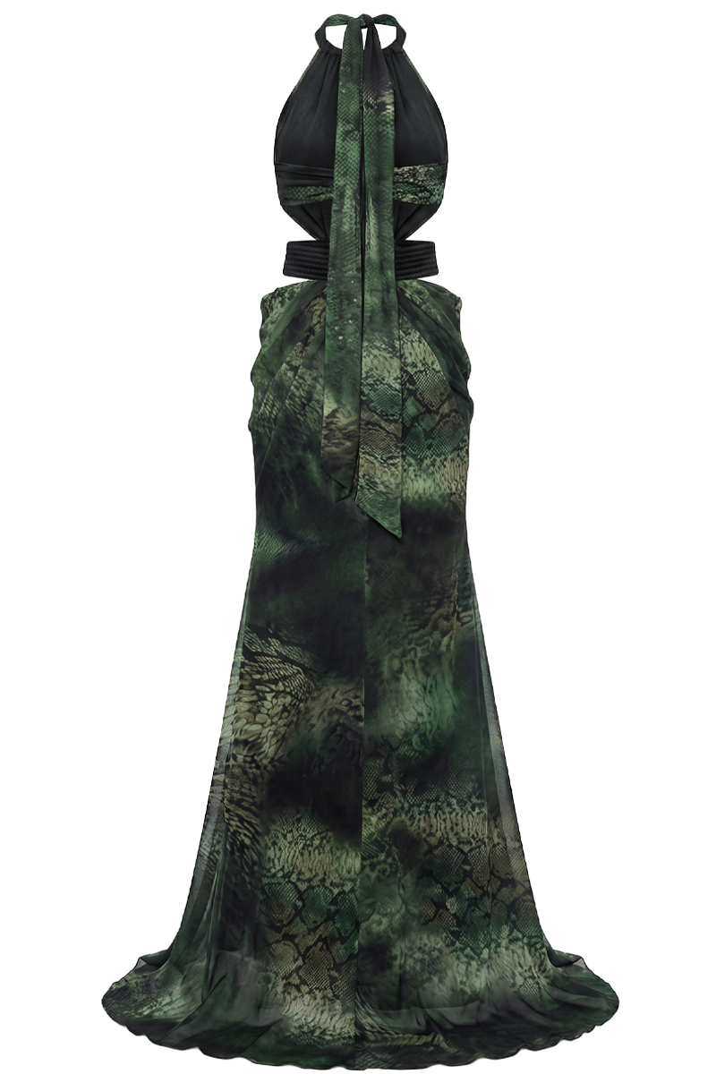 Dugi rukavi s lagano zvonolikim završetkom dodatno omekšavaju siluetu, a dekorativno vezanje na manžetama s uživenim zlatnim metalnim dekoracijama unosi profinjeni vizualni akcent. Prednji prorez osigurava slobodu kretanja i diskretnu dozu senzualnosti, čineći haljinu idealnom za večernje prigode, svečane večere i elegantna događanja.