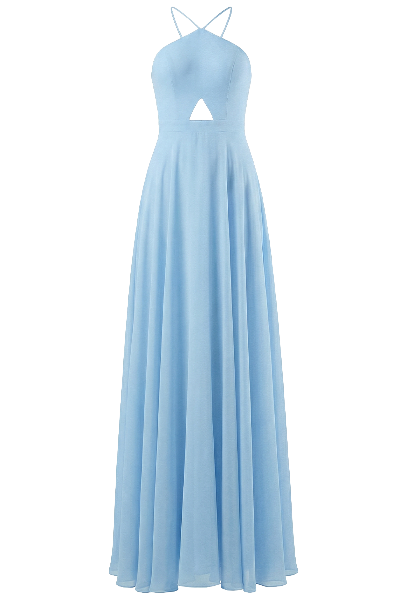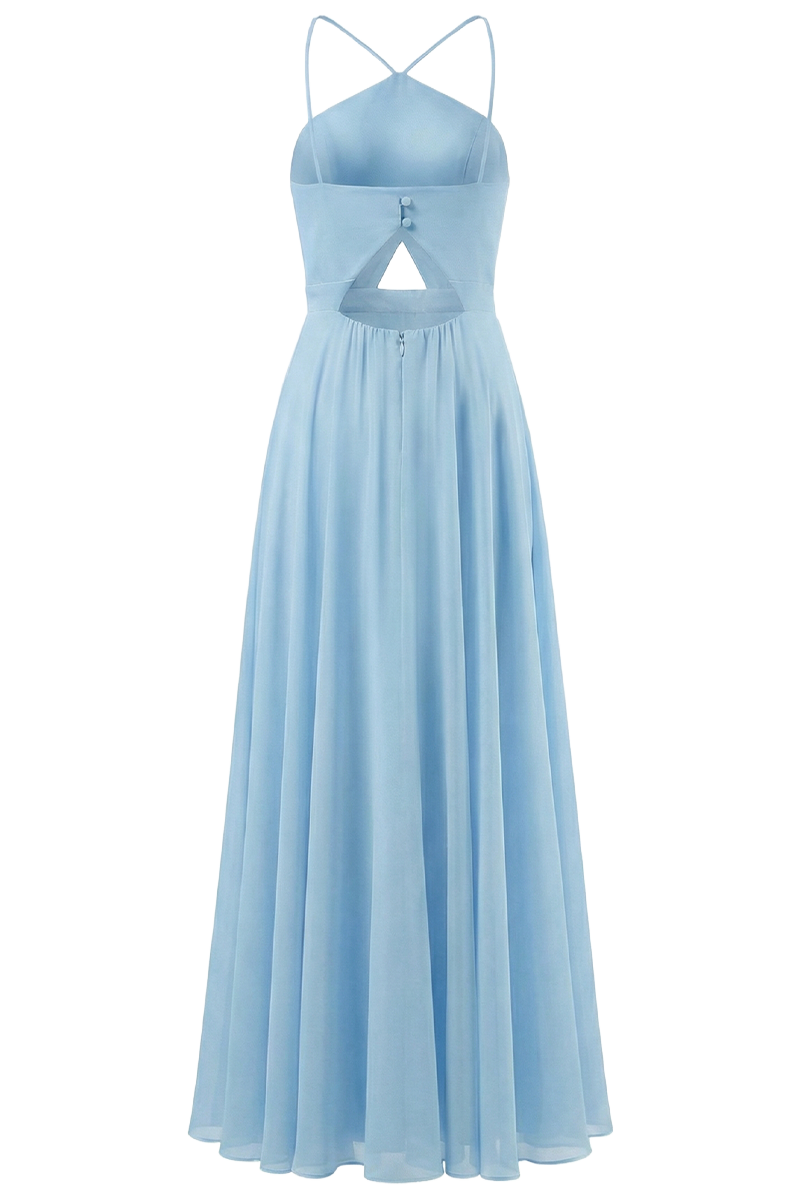 Gornji dio oblikovan je elegantnim, blago zaobljenim dekolteom s tankim naramenicama koje nježno naglašavaju ramena i vrat. Diskretni geometrijski izrez u predjelu struka daje modelu moderan arhitektonski potpis, dok otvorena leđa s precizno krojenim detaljem unose dozu suptilne senzualnosti.