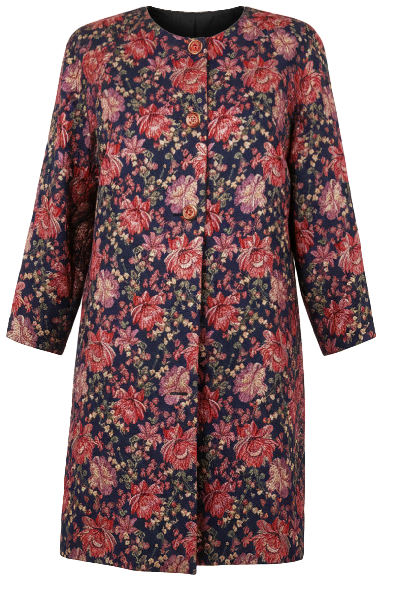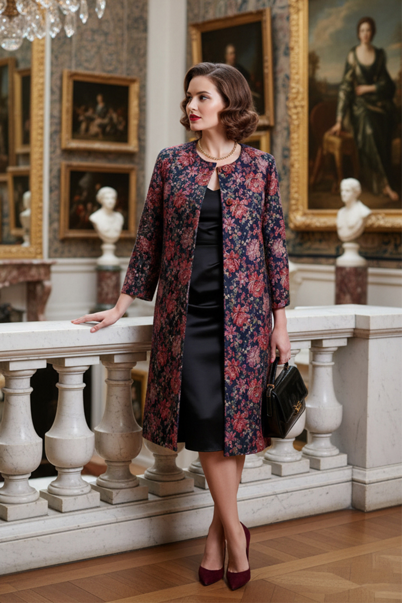 Baloner "Crimson Blossom" unosi toplinu i eleganciju u hladne dane. S bogatim cvjetnim uzorkom u ružičastim i zlatnim tonovima na tamnoj podlozi, ovaj komad odjeće odiše luksuzom i sofisticiranošću. Minimalistički kroj s nježnim gumbima naglašava ženstvenu siluetu, dok kvalitetni brokatni materijal pruža udobnost i dugotrajnost. Unesite dašak romantike i sofisticiranosti u svoju garderobu uz baloner "Crimson Blossom".