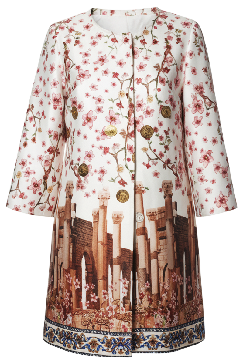 Baloner "Heritage Bloom" predstavlja spoj umjetnosti i mode. Sa sofisticiranim uzorkom ružičastih cvjetova na svijetloj podlozi, u kombinaciji s detaljima arhitektonskih motiva, ovaj komad odiše povijesnim šarmom i modernom elegancijom. Rub ukrašen tradicionalnim ornamentima daje završni dojam luksuza, čineći ga jedinstvenim u svakom pogledu. Ovaj baloner je savršen za žene koje žele unijeti umjetnički duh u svoj svakodnevni stil.