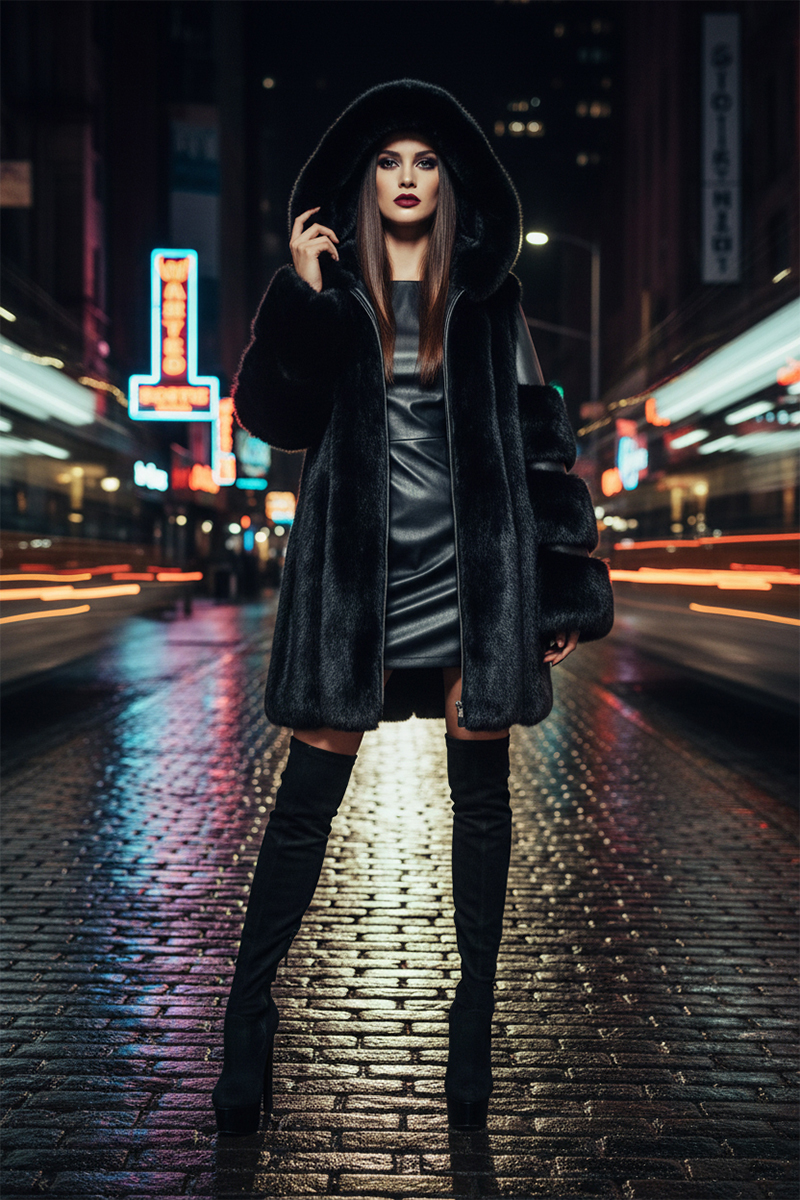 Jakna "Midnight Luxe" kombinira luksuz kvalitetnih materijala – umjetnog krzna vrhunske kvalitete i kožne tkanine – koji pružaju spoj luksuza i trajnosti. U elegantnoj crnoj boji, ova jakna oduševljava bogatom kapuljačom, voluminoznim rukavima i profinjenim kontrastom između mekanog krzna i glatke kožne tkanine. Dizajnirana za hladne dane, nudi savršenu kombinaciju topline i stila, idealnu za svečane izlaske, urbane šetnje ili posebne prigode jer podiže svaki outfit na višu razinu.