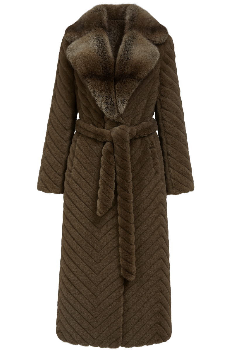 Kaput "Mocha Luxe" savršen je spoj luksuza i topline, izrađen od umjetne krznene tkanine visoke kvalitete s uzorkom nutrije. Eleganciji ovog modela dodatno doprinosi voluminozan ovratnik izrađen od umjetnog krzna lisice, koji unosi sofisticiranost i naglašava profinjen stil. Kaput u bogatoj smeđoj nijansi upotpunjen je pojasom u struku za savršeno prilagođavanje i chevron uzorkom koji donosi vizualnu dinamiku. Idealan za zimske večeri, svečane prigode ili elegantne šetnje, "Mocha Luxe" donosi bezvremenski stil za svaku priliku.
