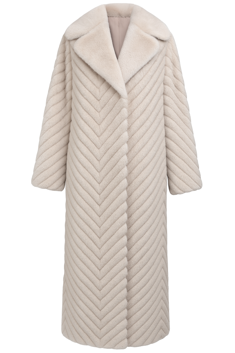 Kaput "Pearl Luxe" ističe se svojom profinjenom elegancijom i udobnošću. Izrađen od vrhunske umjetne krznene tkanine s uzorkom inspiriranim nutrijom, ovaj kaput pruža luksuzan izgled i toplinu potrebnu za hladne zimske dane. Prepoznatljiv chevron uzorak u kombinaciji s nježnom bež nijansom čini ga bezvremenskim komadom. Opušteni kroj osigurava ugodno nošenje, dok voluminozni ovratnik dodatno naglašava sofisticiranost.