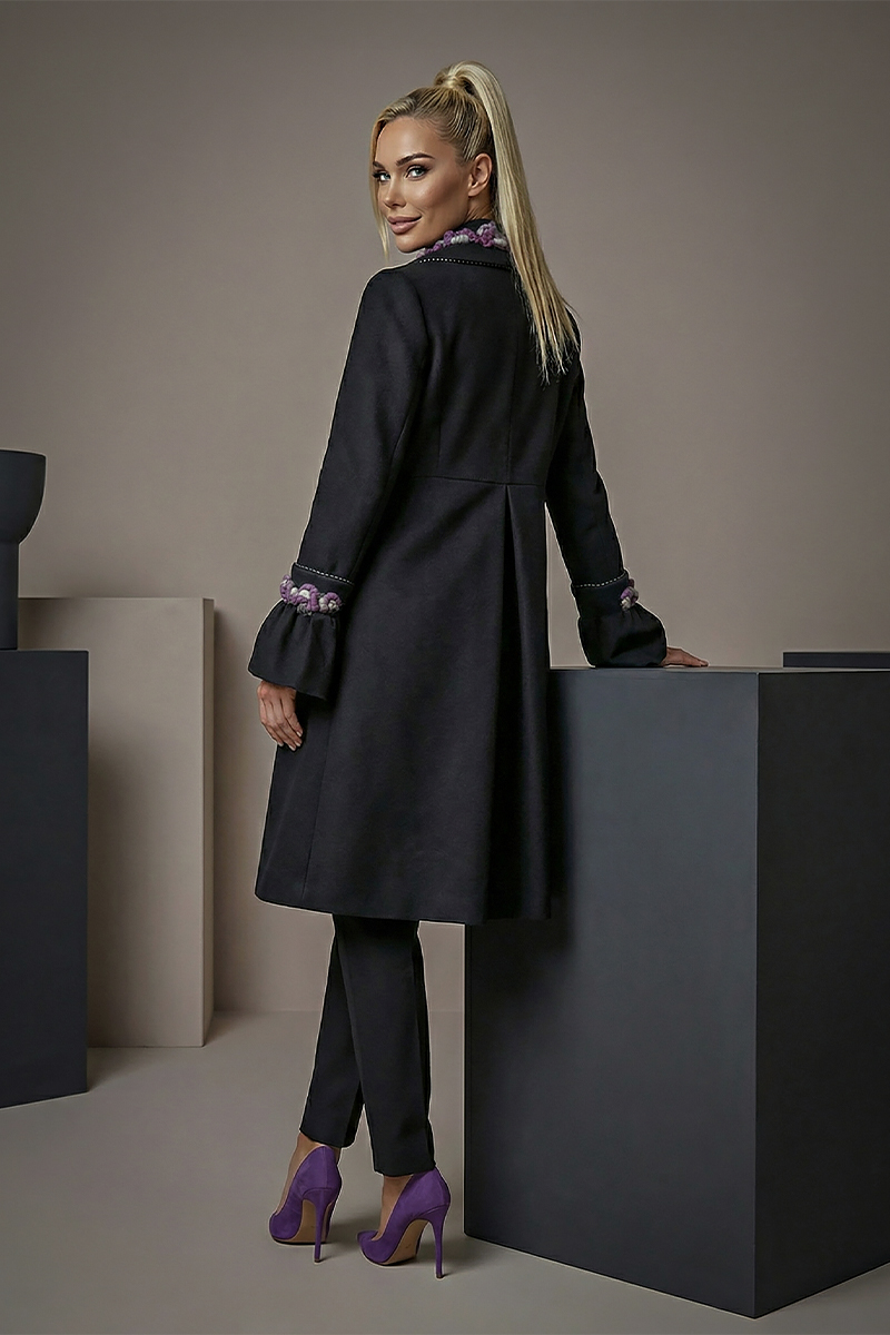 Aristelle Poise je profinjeni kaput klasične siluete s naglašenim couture karakterom i pažljivo oblikovanim detaljima od vune izrađenima ručno. Strukturirani kroj lijepo prati liniju tijela, dok dekorativni veliki gumbi i suptilni ručni naglasci daju ovom modelu jedinstven i elegantan identitet. Posebnost kaputa Aristelle Poise leži u vunenim dekoracijama koje su unikatne i ručno izrađene, čime svaki komad dobiva individualan karakter.
