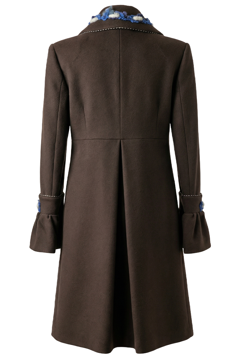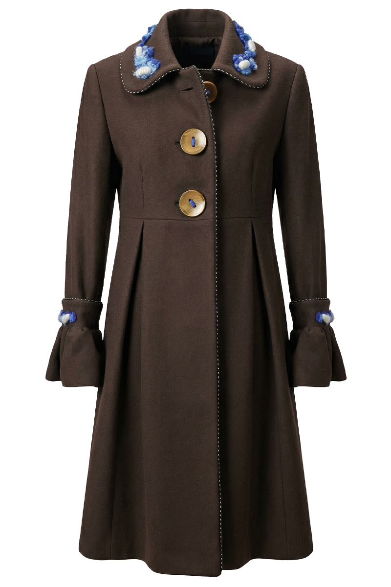 Prikazana je preporučena kombinacija boje kaputa, vunene dekoracije i gumba. Ostale boje vune i opcije gumba dostupne su na izbor. Dekorativni vez izrađuje se ručno – odabrana boja vune određuje ton dekoracije, dok nijanse, motiv i raspored mogu varirati. Zbog ručne izrade, svaki kaput je jedinstven.