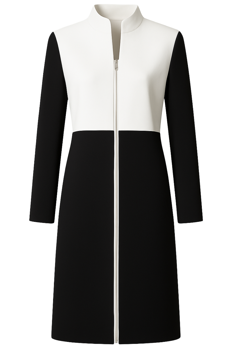 Kaput "Metro Edge" savršen je spoj elegancije i modernog dizajna. Jedinstvena kombinacija crne i bijele boje naglašava sofisticiranost i minimalizam, dok ravne linije kroja osiguravaju besprijekoran izgled. Izrađen od visokokvalitetnih materijala, ovaj kaput pruža toplinu i udobnost, idealan za svakodnevne i formalne prilike. Dugi patent zatvarač dodatno doprinosi modernom i funkcionalnom dizajnu. Idealan za formalne večere, poslovne sastanke te svakodnevne izlaske.