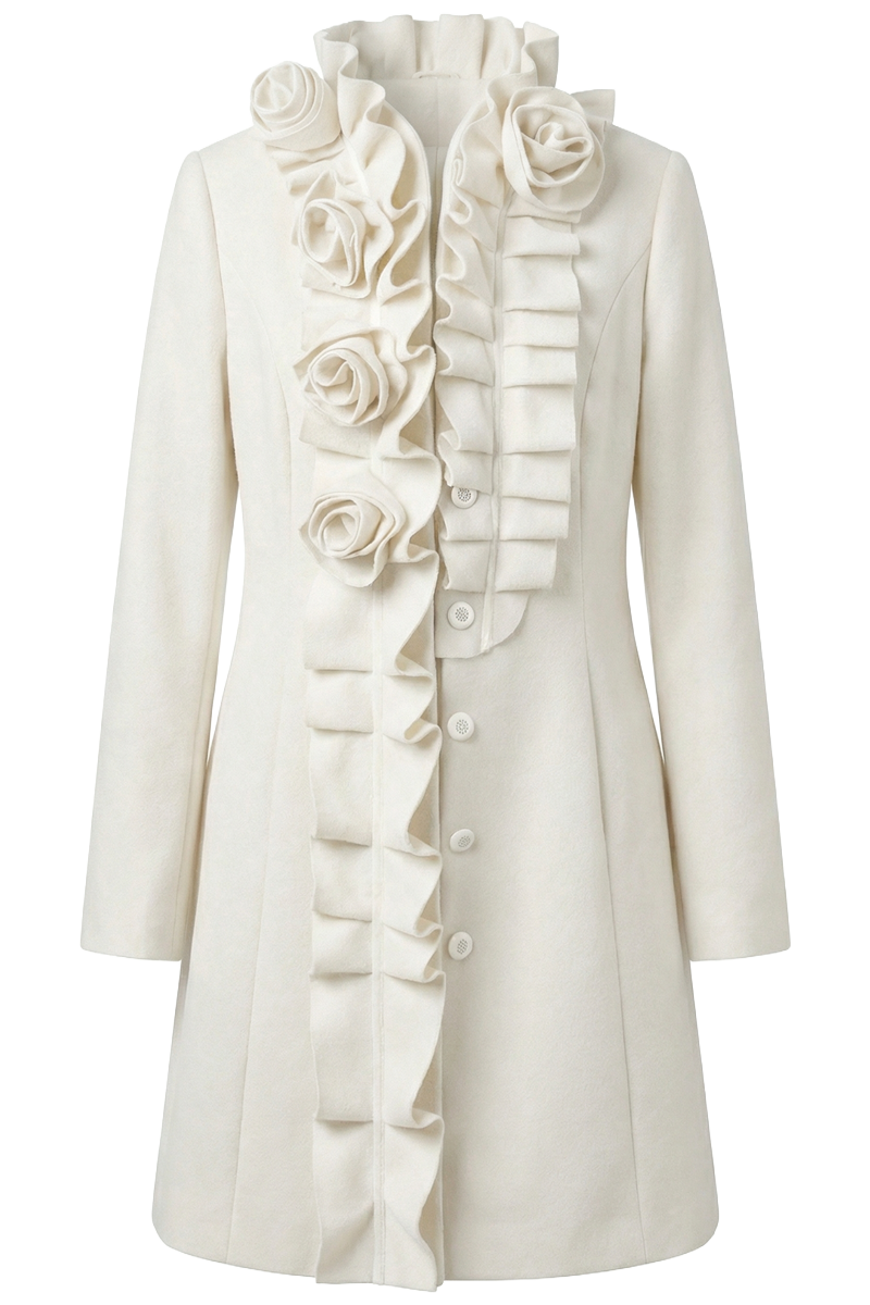 Kaput Rosette Silhouette izrađen je od 100% prirodne vune i oblikovan u strukiranoj, elegantnoj silueti koja naglašava ženstvenu liniju tijela. Posebnost ovog kaputa čine ručno izrađene ruže, pažljivo aplicirane uz prednji dio, koje mu daju izražen umjetnički i couture karakter.