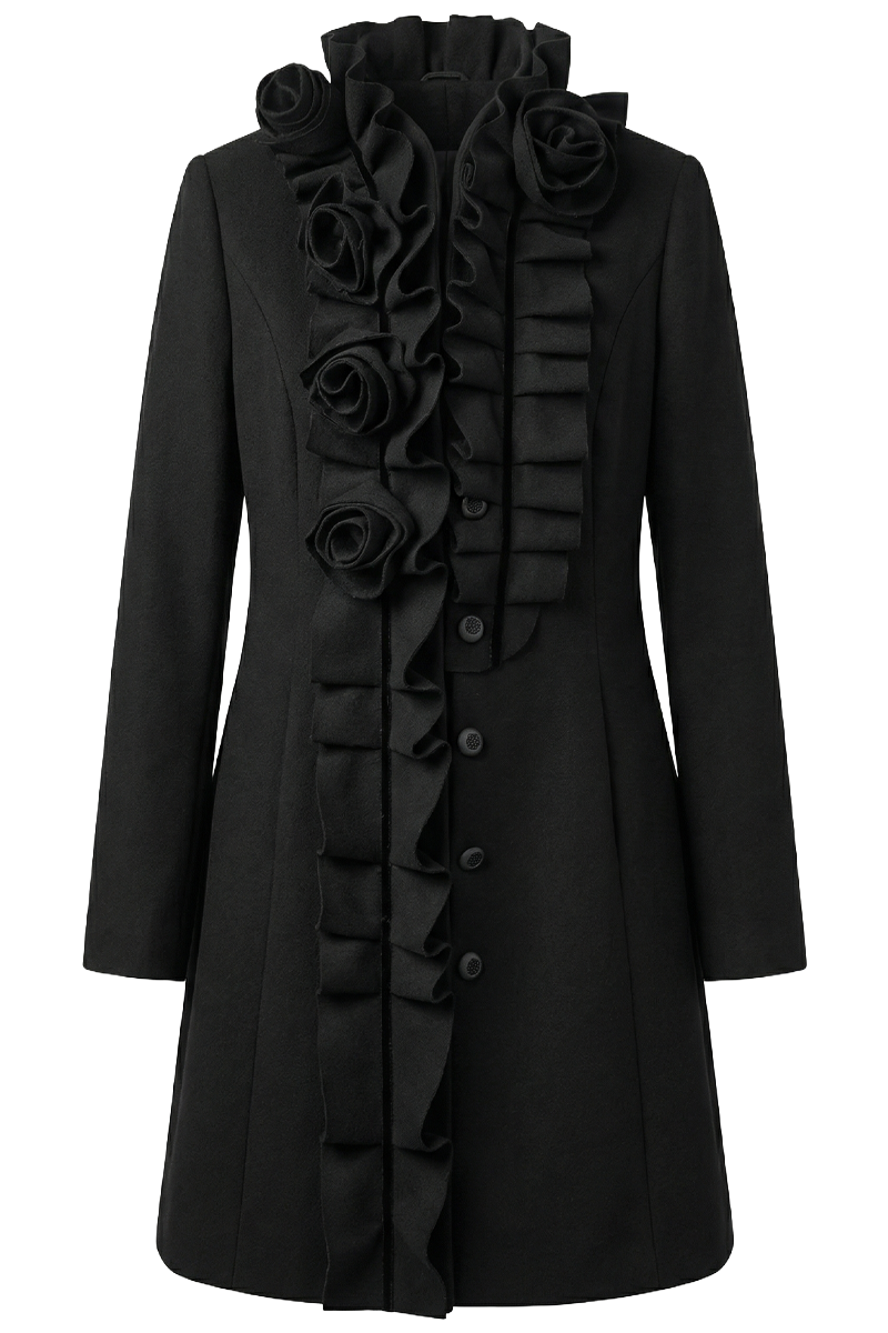 Kaput Rosette Silhouette izrađen je od 100% prirodne vune i oblikovan u strukiranoj, elegantnoj silueti koja naglašava ženstvenu liniju tijela. Posebnost ovog kaputa čine ručno izrađene ruže, pažljivo aplicirane uz prednji dio, koje mu daju izražen umjetnički i couture karakter.