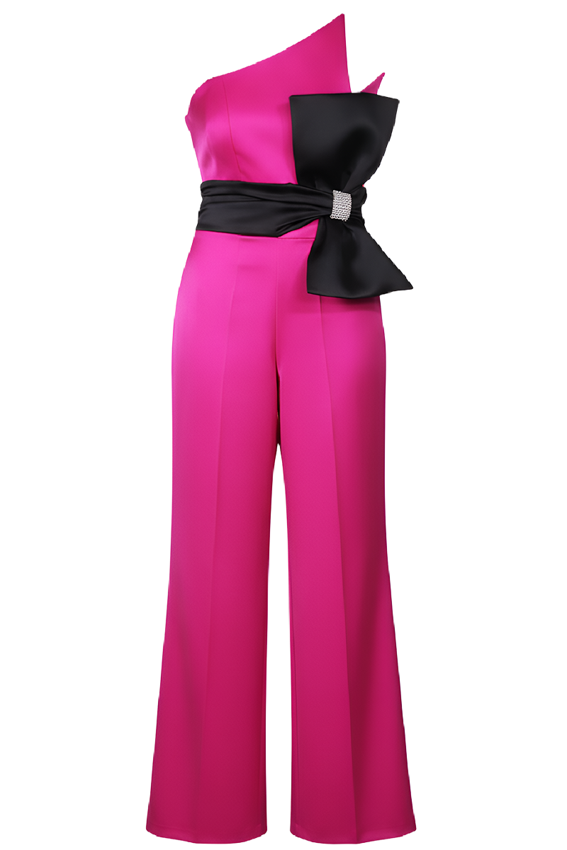 Kombinezon "Nova Charisma" odiše modernim luksuzom i odvažnošću. U vibrantnoj fuksija boji, ovaj model privlači pažnju svojim jedinstvenim asimetričnim dizajnom i raskošnim crnim remenom s velikom mašnom ukrašenom detaljem od kristala. Široke nogavice vizualno izdužuju siluetu, dok sofisticirani kroj donosi savršenu ravnotežu između ženstvenosti i moći. Idealno za gala večeri, modne proslave i svečane događaje.