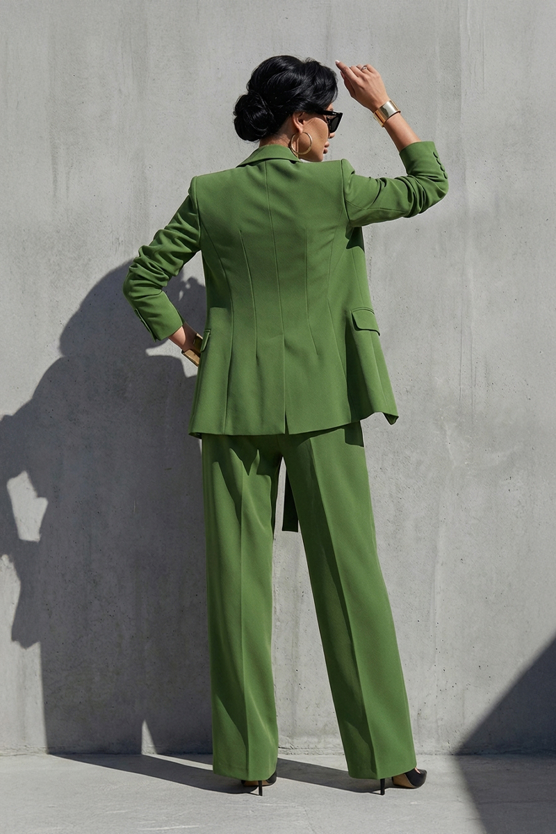 Sako je oblikovan s dubokim reverima i strukturiranom formom koja prati liniju tijela, suptilno ističući struk. Široke hlače visokog struka produžuju figuru i donose dozu sofisticirane opuštenosti, čime se postiže savršen balans između autoriteta i ženstvenosti.