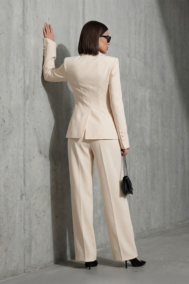 Sako je oblikovan s dubokim reverima i strukturiranom formom koja prati liniju tijela, suptilno ističući struk. Široke hlače visokog struka produžuju figuru i donose dozu sofisticirane opuštenosti, čime se postiže savršen balans između autoriteta i ženstvenosti.