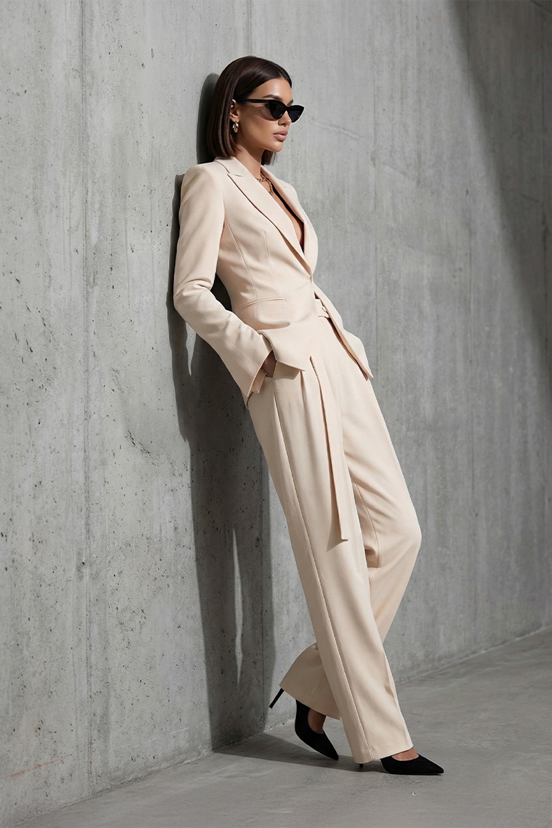 Sako je oblikovan s dubokim reverima i strukturiranom formom koja prati liniju tijela, suptilno ističući struk. Široke hlače visokog struka produžuju figuru i donose dozu sofisticirane opuštenosti, čime se postiže savršen balans između autoriteta i ženstvenosti.