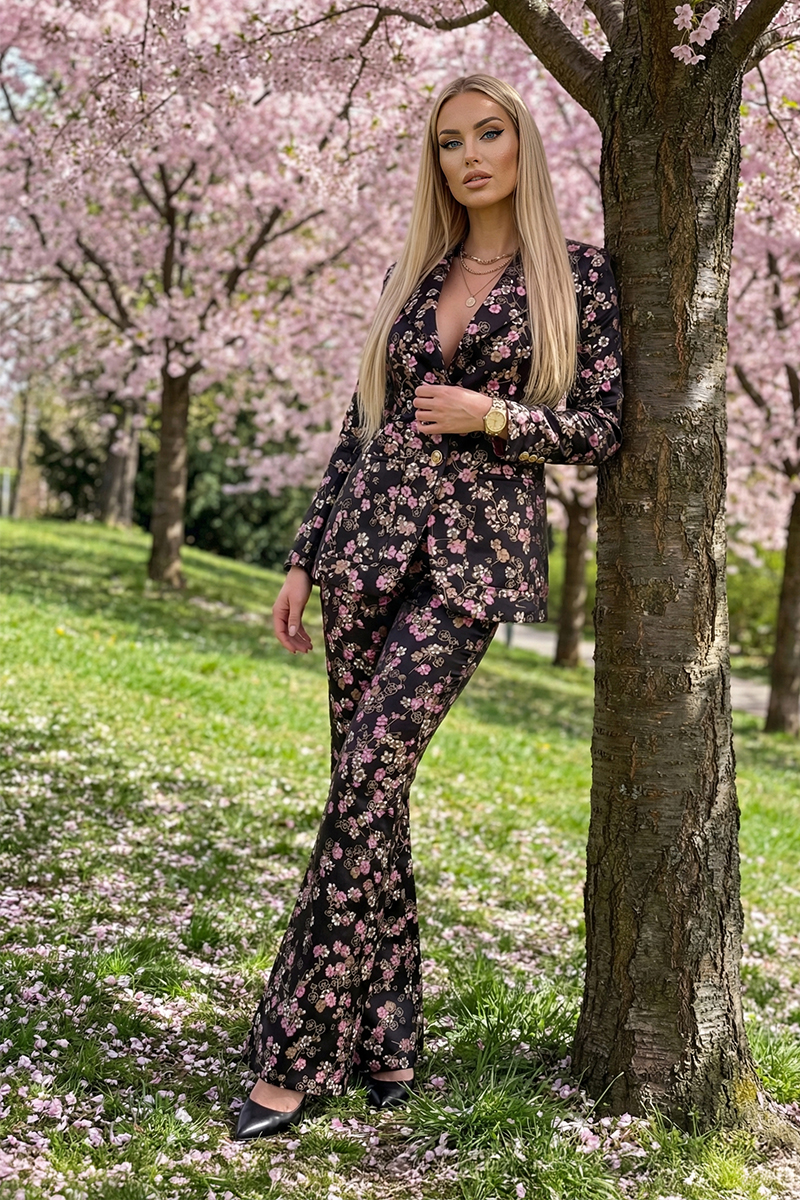 Odijelo Sakura Theory spaja strukturiranu siluetu i izražajan cvjetni uzorak u sofisticiranu modnu izjavu. Inspirirano estetikom rascvjetanih grana, ovaj model donosi snažan vizualni identitet, ali zadržava preciznost kroja i eleganciju forme.