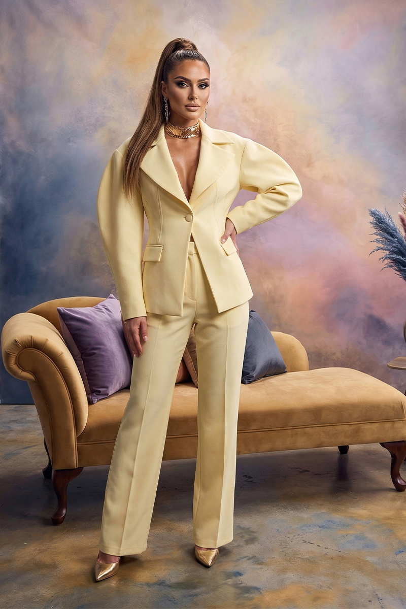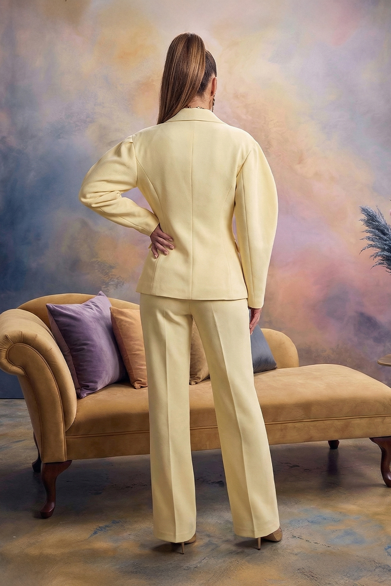 Duboki reveri i čista prednja linija daju sofisticirani karakter, dok pažljivo oblikovan struk vizualno izdužuje figuru. Hlače ravnog, blago širokog kroja elegantno padaju uz tijelo i produžuju liniju nogu, stvarajući skladan i luksuzan dojam.