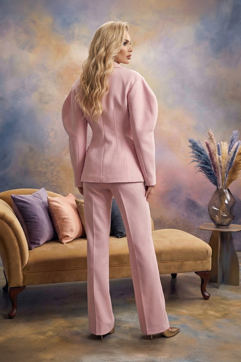 Duboki reveri i čista prednja linija daju sofisticirani karakter, dok pažljivo oblikovan struk vizualno izdužuje figuru. Hlače ravnog, blago širokog kroja elegantno padaju uz tijelo i produžuju liniju nogu, stvarajući skladan i luksuzan dojam.