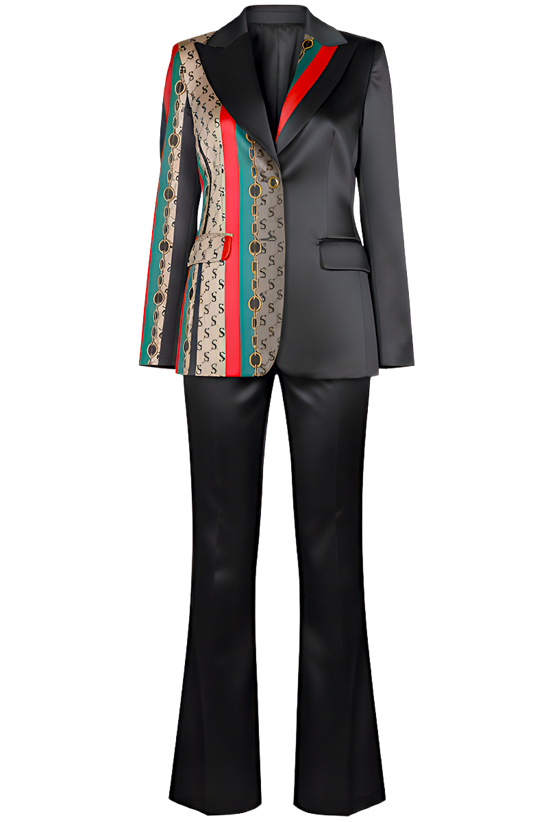 Odijelo "Avant-Garde Flair" savršena je kombinacija odvažnog dizajna i sofisticirane elegancije. Svojim upečatljivim uzorkom, kontrastnim bojama i besprijekornim krojem, ovo odijelo unosi dozu odvažnosti u svaki outfit. Sakoi s detaljima na reverima i uzorkom čine ga istaknutim izborom za osobe s izraženim stilom. Hlače krojene s naglaskom na udobnost i sofisticiranost savršeno nadopunjuju cjelokupan izgled.