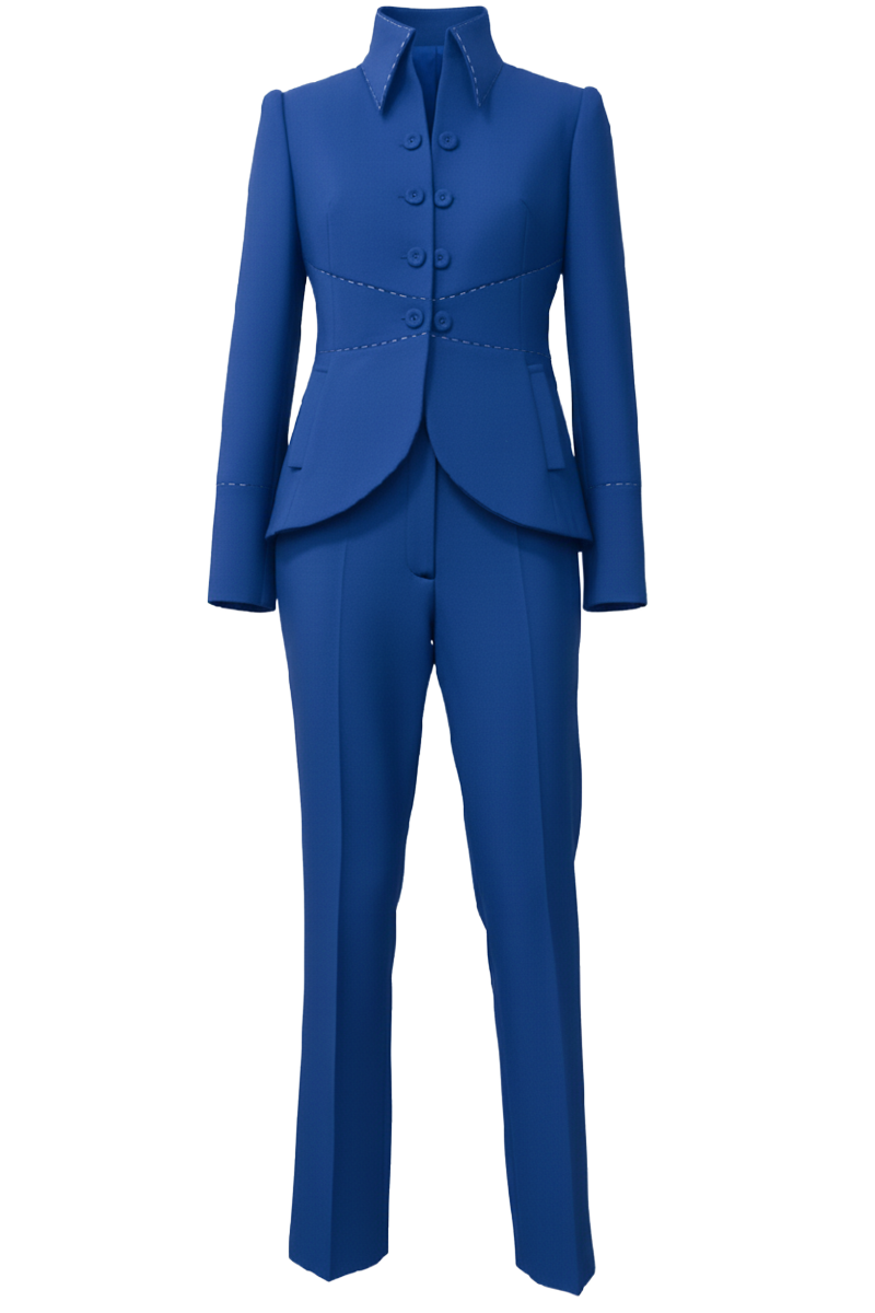Odijelo "Classic Impression" savršeni je izbor za dame koje žele kombinaciju elegancije, profesionalizma i modernog dizajna. Njegov precizan kroj naglašava siluetu i odiše sofisticiranošću. Jakna s naglašenim strukom i suptilnim detaljima pruža klasičan, a istovremeno suvremen izgled. Hlače visokog struka upotpunjuju sklad ove kombinacije, čineći je idealnim za poslovne sastanke, formalne događaje i svečane prilike.