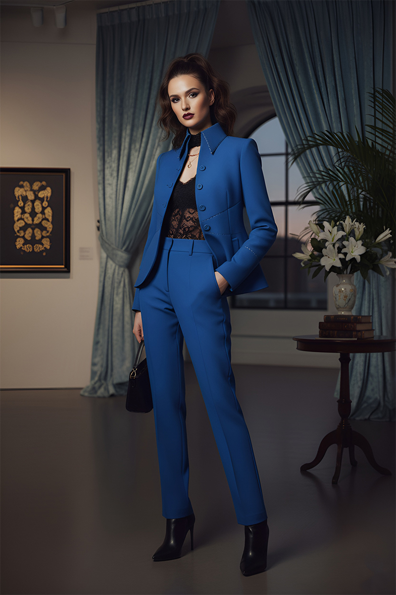 Odijelo "Classic Impression" savršeni je izbor za dame koje žele kombinaciju elegancije, profesionalizma i modernog dizajna. Njegov precizan kroj naglašava siluetu i odiše sofisticiranošću. Jakna s naglašenim strukom i suptilnim detaljima pruža klasičan, a istovremeno suvremen izgled. Hlače visokog struka upotpunjuju sklad ove kombinacije, čineći je idealnim za poslovne sastanke, formalne događaje i svečane prilike.