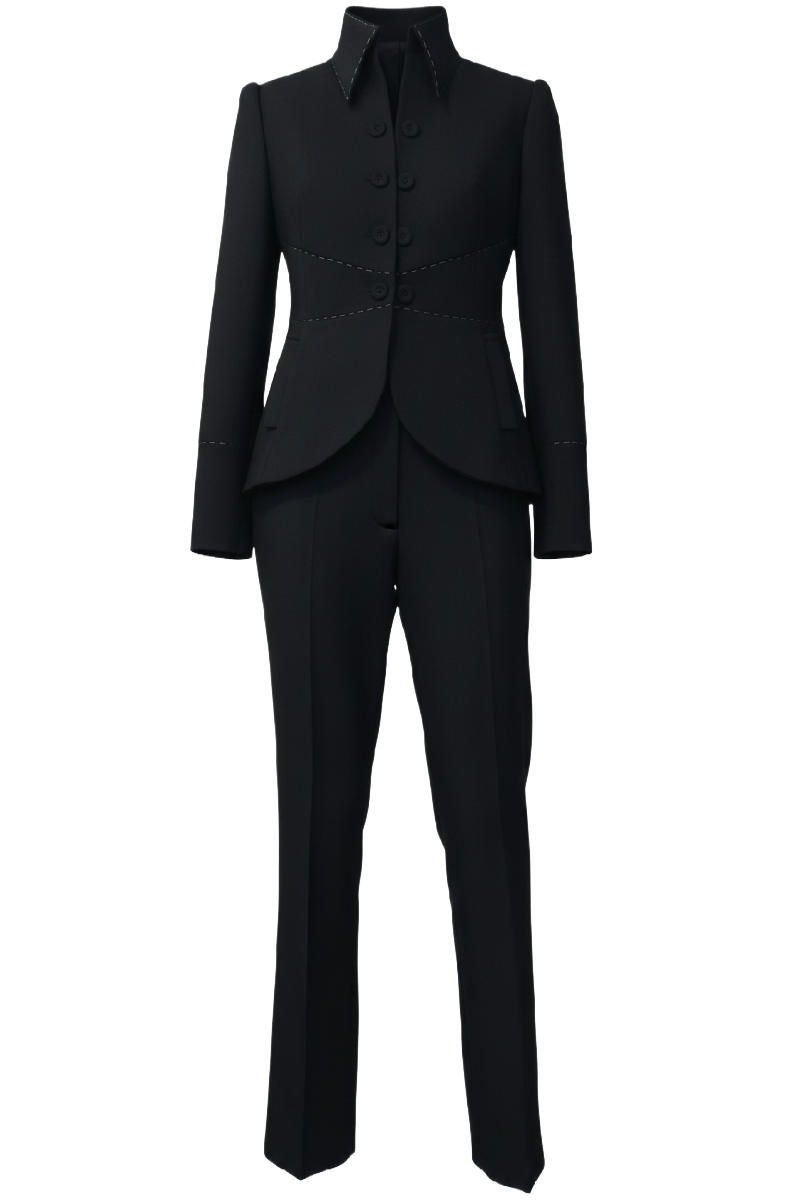 Odijelo "Classic Impression" savršeni je izbor za dame koje žele kombinaciju elegancije, profesionalizma i modernog dizajna. Njegov precizan kroj naglašava siluetu i odiše sofisticiranošću. Jakna s naglašenim strukom i suptilnim detaljima pruža klasičan, a istovremeno suvremen izgled. Hlače visokog struka upotpunjuju sklad ove kombinacije, čineći je idealnim za poslovne sastanke, formalne događaje i svečane prilike.