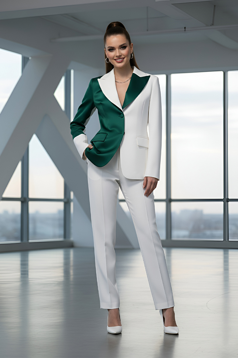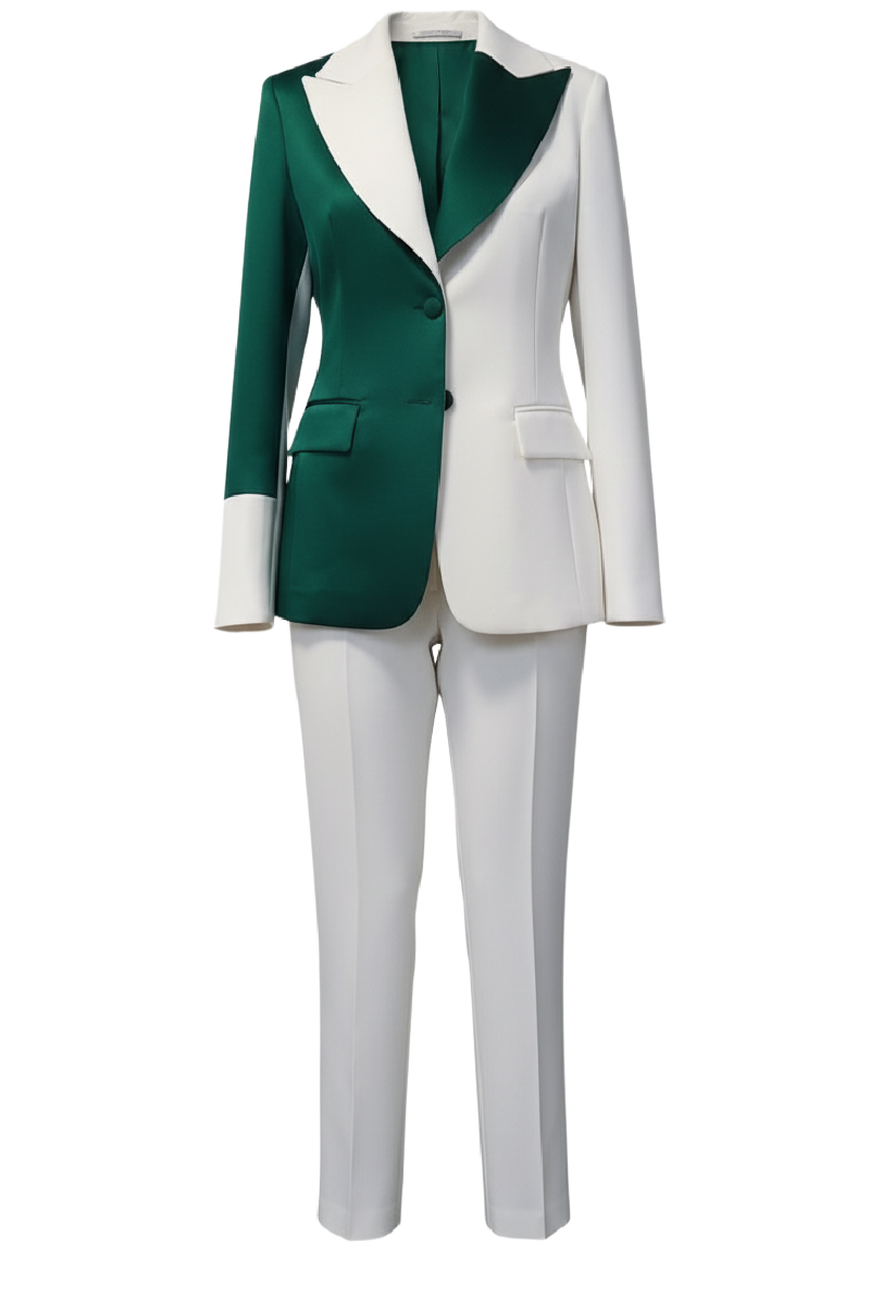 Odijelo "Emerald Ivy" utjelovljuje savršen spoj sofisticiranosti i suvremenog dizajna. S pažljivo biranom kombinacijom smaragdno zelene i čiste bijele boje, ovo odijelo odiše luksuzom i individualnošću. Sako elegantnog kroja s profinjenim reverima i precizno krojene hlače pružaju savršen spoj stila i udobnosti. Klasično odijelo s modernim detaljima u dvobojnoj kombinaciji. Idealno za poslovne sastanke, svečane događaje ili posebne prilike.