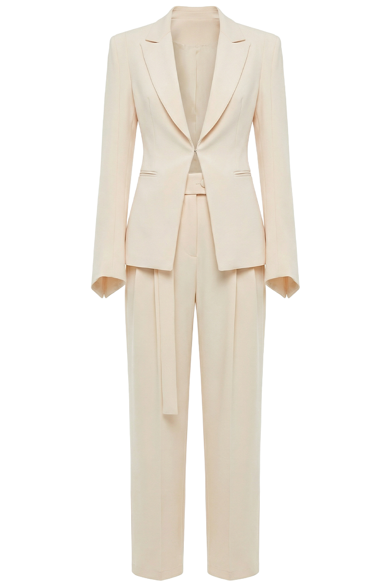 Sako je oblikovan s dubokim reverima i strukturiranom formom koja prati liniju tijela, suptilno ističući struk. Široke hlače visokog struka produžuju figuru i donose dozu sofisticirane opuštenosti, čime se postiže savršen balans između autoriteta i ženstvenosti.