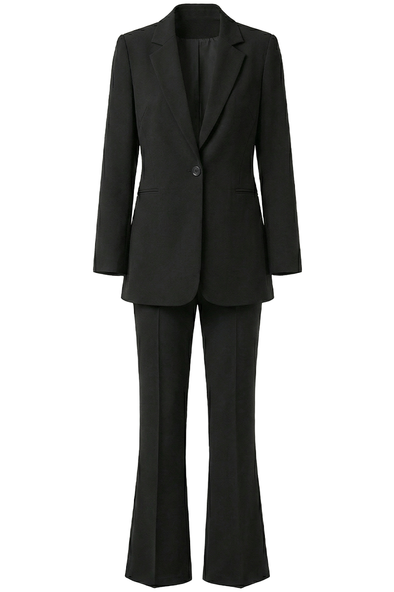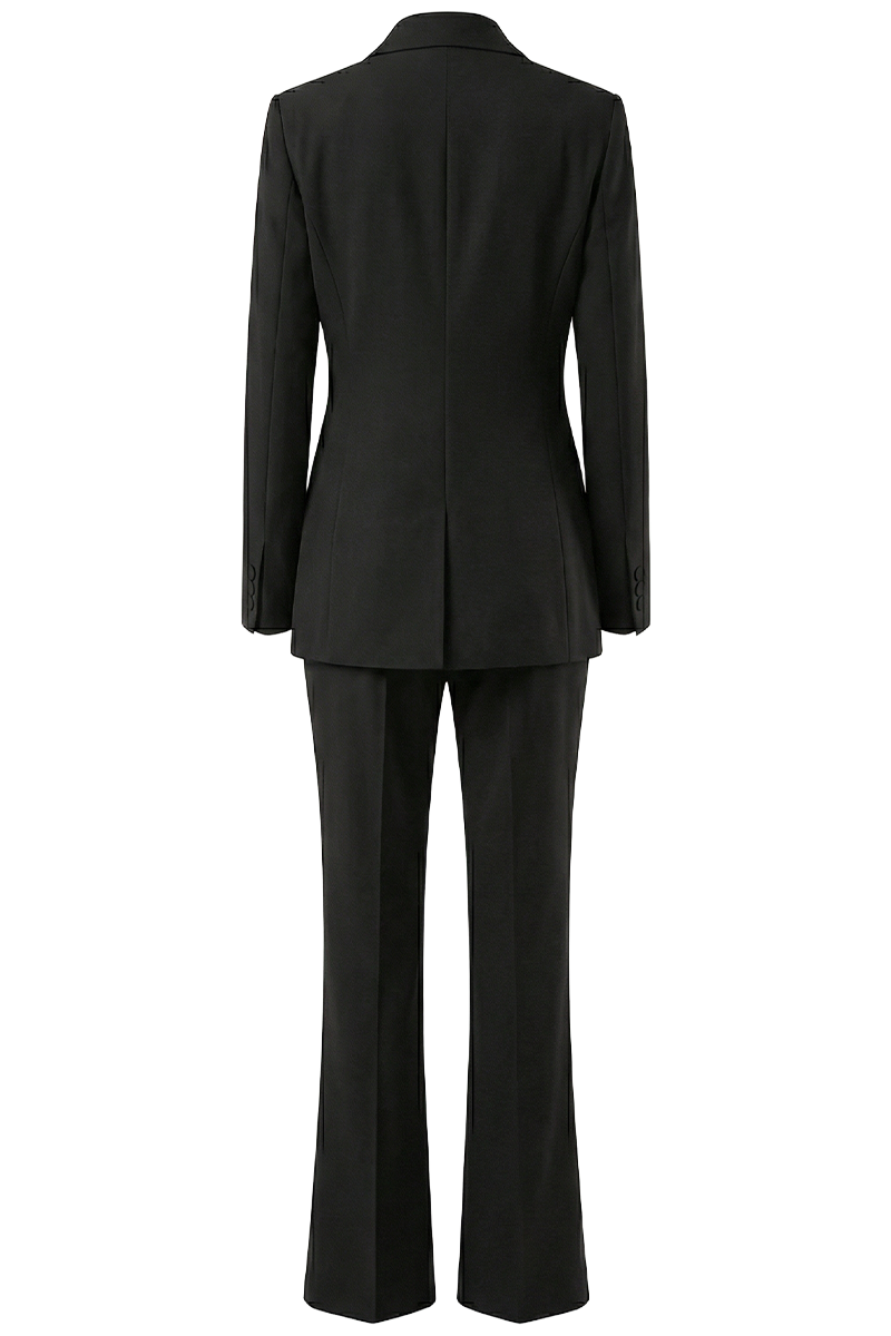 Dulji kroj sakoa vizualno izdužuje figuru, dok diskretno naglašen struk donosi ženstvenu ravnotežu između strukture i mekoće. Hlače blago zvonolikog kroja prate liniju tijela i šire se prema dnu, stvarajući elegantan, produžen efekt nogu. Čiste linije i minimalistički dizajn čine ovaj komplet bezvremenskim komadom garderobe.
