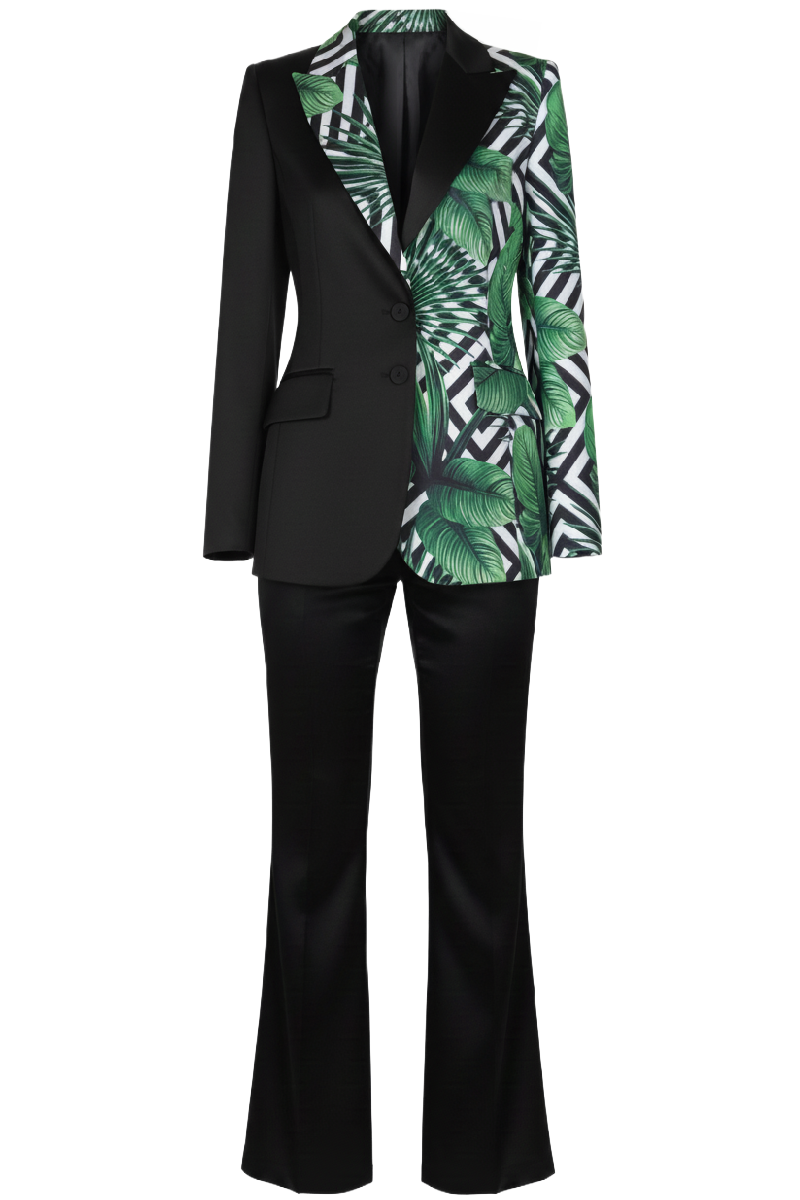 Odijelo "Tropical Elegance" savršeno kombinira klasičnu sofisticiranost s jedinstvenim modernim detaljem. Sačinjeno od visokokvalitetne tkanine, ovo odijelo karakterizira elegantni crni sako sa živopisnim tropskim uzorkom na reverima, pružajući izvanredan kontrast. Idealno za poslovne prilike ili svečane događaje, ovo odijelo nudi ne samo udobnost, već i stilski potpis koji ne prolazi nezapaženo.