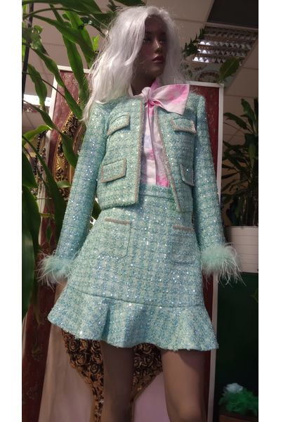 Kostim "Aqua Sparkle" zrači očaravajućom igrom boja i svjetla, stvoreno za žene koje cijene sofisticiranost i jedinstveni stil. Sastavljeno od kvalitetnog tkanog materijala s upečatljivim svjetlucavim detaljima, ovaj kostim je idealan za svečane prilike. Opremljeno sa šik jaknom s oštrim reverima i elegantnom suknjom koja blago prati liniju tijela, pruža iznimnu udobnost i savršeno pristaje. Završni dodir čine krznene manžete koje dodaju dodatnu dozu luksuza i stila.