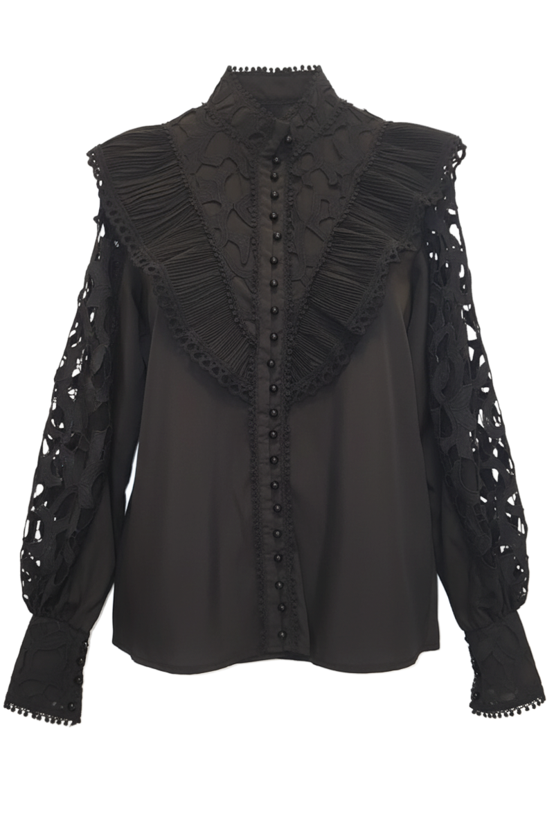 Lace Reverie je profinjena bluza koja spaja romantične detalje i bezvremensku eleganciju. Bogata čipka, plisirani detalji i pažljivo oblikovana silueta stvaraju sofisticiran izgled s dozom suptilne dramatike. Visoki ovratnik i naglašeni rukavi dodatno ističu njezin elegantan karakter. Ova bluza idealna je za posebne prigode, večernje izlaske ili elegantne dnevne kombinacije. Lako se uklapa uz klasične hlače, suknje ili traperice, čineći je svestranim komadom koji podiže svaki outfit. Lace Reverie namijenjena je ženama koje cijene detalje, profinjen stil i romantičnu estetiku s modernim dodirom.