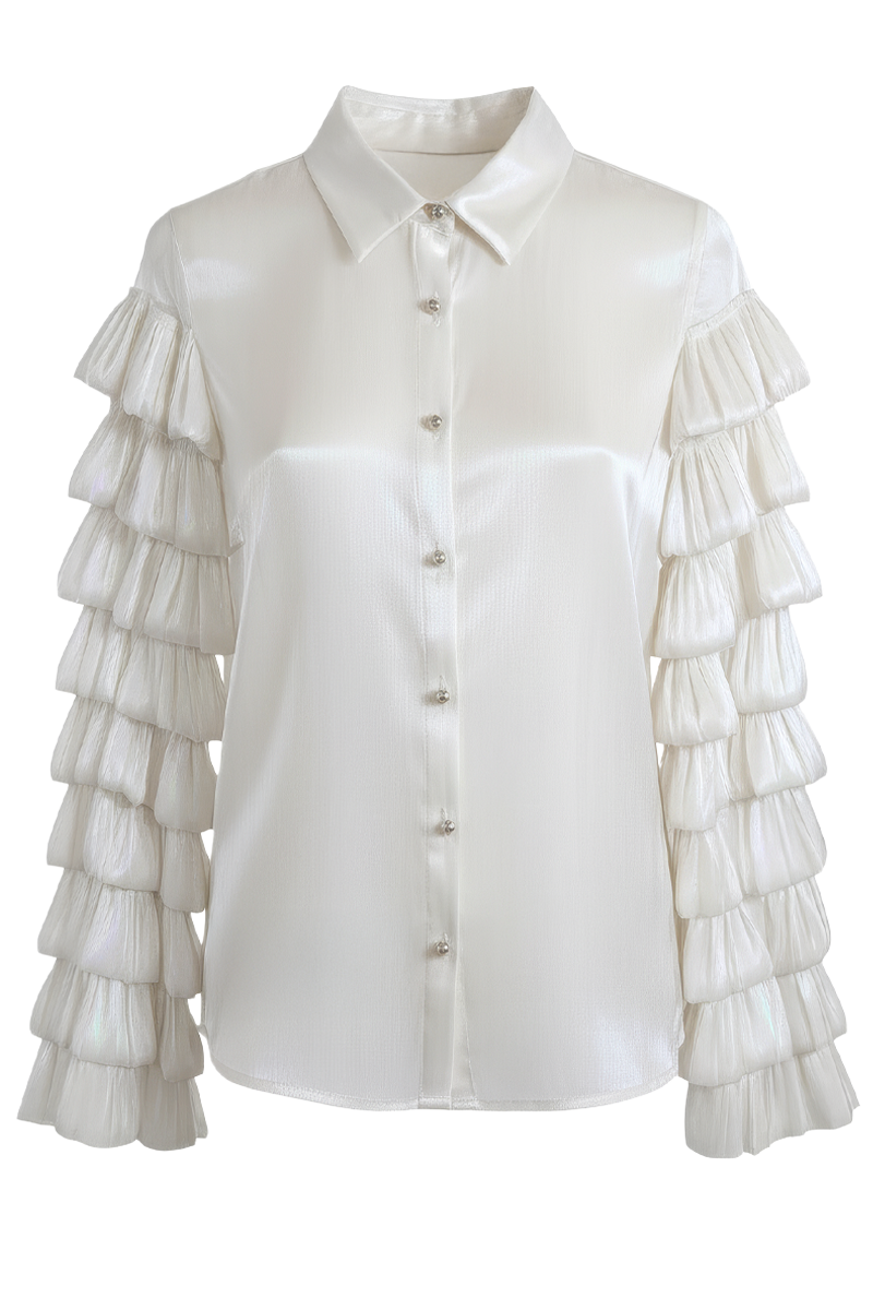 Pearl Ruffle bluza donosi spoj elegancije, umjetničkog dizajna i profinjenog sjaja. Izrađena od laganog, blago sjajnog materijala, ova košulja osvaja već na prvi pogled — no najveći naglasak nose dramatični višeslojni rukavi koji stvaraju efekt bisernih volana i pružaju raskošan, couture dojam. Dizajnirana za žene koje obožavaju izraziti svoj stil, Pearl Ruffle je istovremeno glamurozna i nosiva. Savršena je za svečane kombinacije, večernje izlaske, poslovne evente ili trenutke kada želiš izgledati posebno bez pretjeranog truda. Blago oversized kroj i elegantna silueta čine je udobnom i fluidnom, dok biserni gumbi dodaju završni luksuzni pečat. U kombinaciji s elegantnim hlačama, suknjom visokog struka ili minimalističkim nakitom, ova košulja pretvara svaku odjevnu kombinaciju u modnu izjavu.