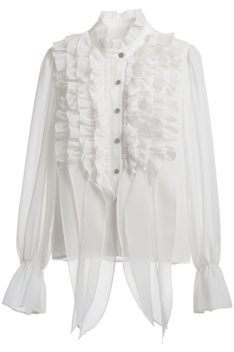 Prednji dio krase dramatični, višeslojni volani raspoređeni u vertikalnim linijama koje vizualno izdužuju figuru. Poseban naglasak daje viktorijanska ruffle kragna, jedan od najprepoznatljivijih elemenata haute couture estetike, dok su manžete ukrašene efektnim, proširenim završetkom koji dodatno naglašava romantičnu siluetu.
