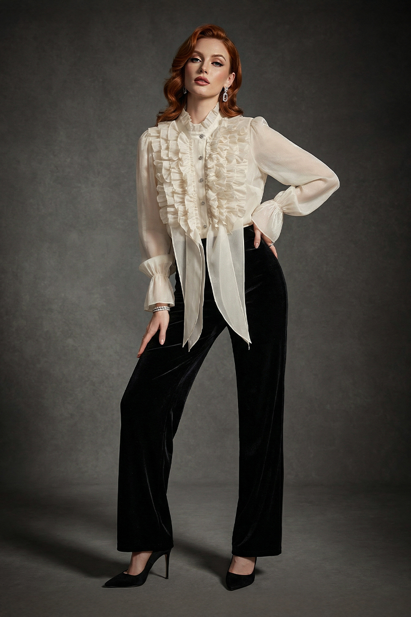 Bluza Royal Finesse utjelovljuje savršenu ravnotežu profinjene klasike i luksuzne teatralnosti, stvarajući komad koji ne prolazi nezapaženo. Izrađena od laganog, svilenkastog materijala s decentnim sjajem, ova bluza podiže svaku kombinaciju na višu razinu.